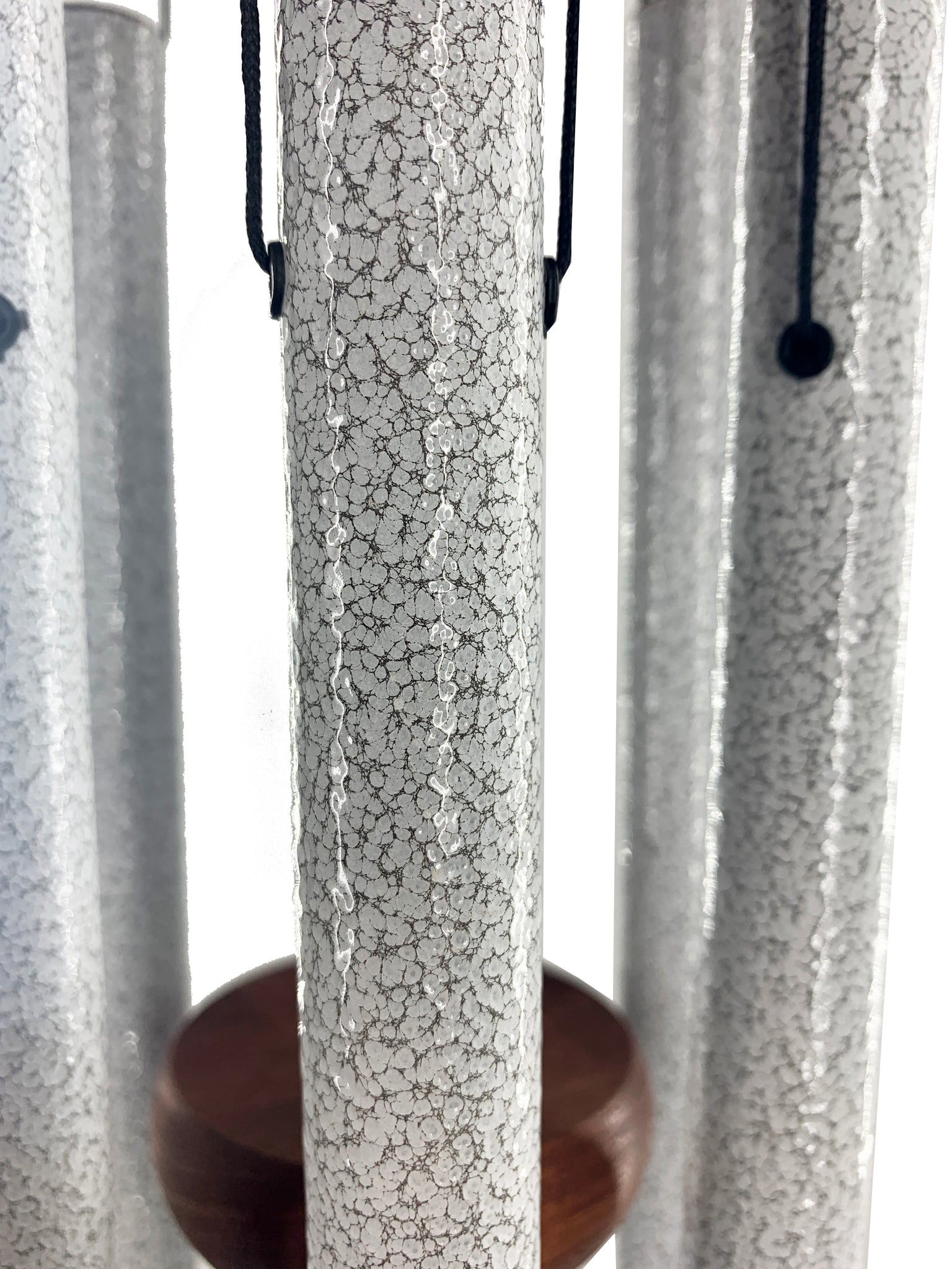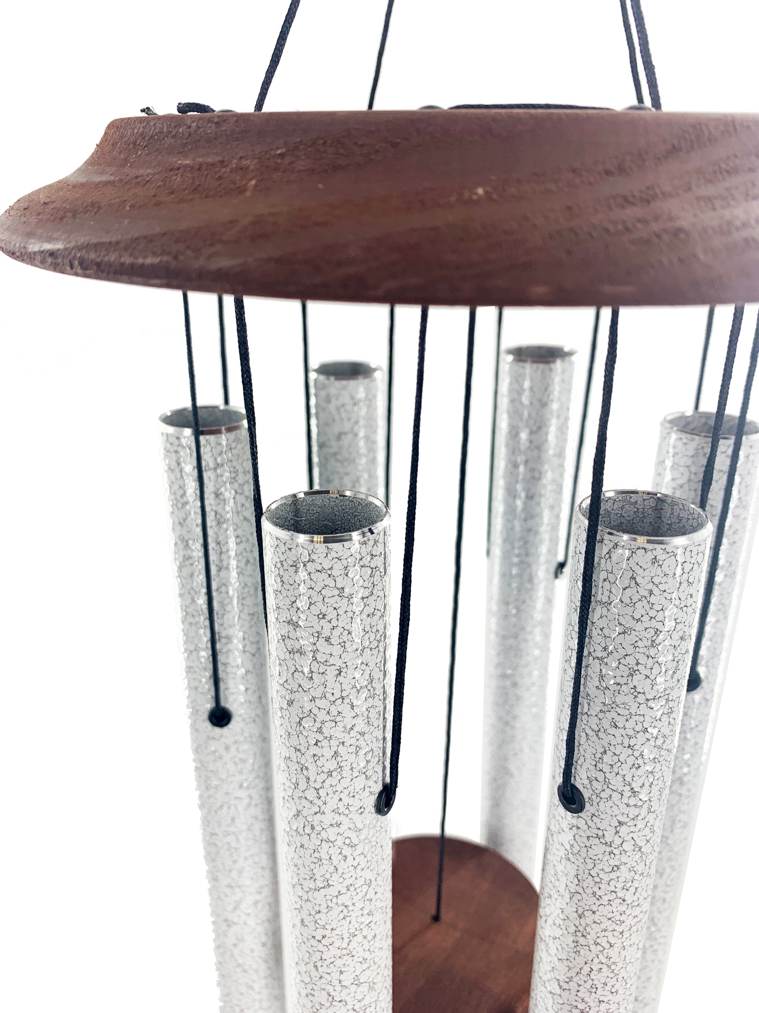 • Chime measures 34 inches from the top of the hanging cord to the end of the sail. The silver aluminum tubes vary in length measuring 10-13.5 inches. The wood color is teak walnut finish and each chime is hand tuned to a medium pleasant soothing tone.